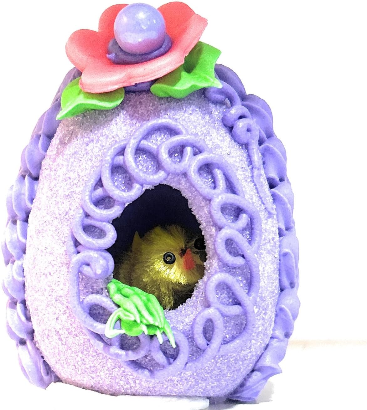 Beautiful handcrafed Super fine Sugar Egg, Decorated with Royal icing, and a fondant floral design, inside the peeka boo hole is a cute little chick made of chenille.Decorator may use a flower or Easter Ring of a Rabbit or Chick, All flowers are made of fondant, gumpaste or royal icing and are totally edible.